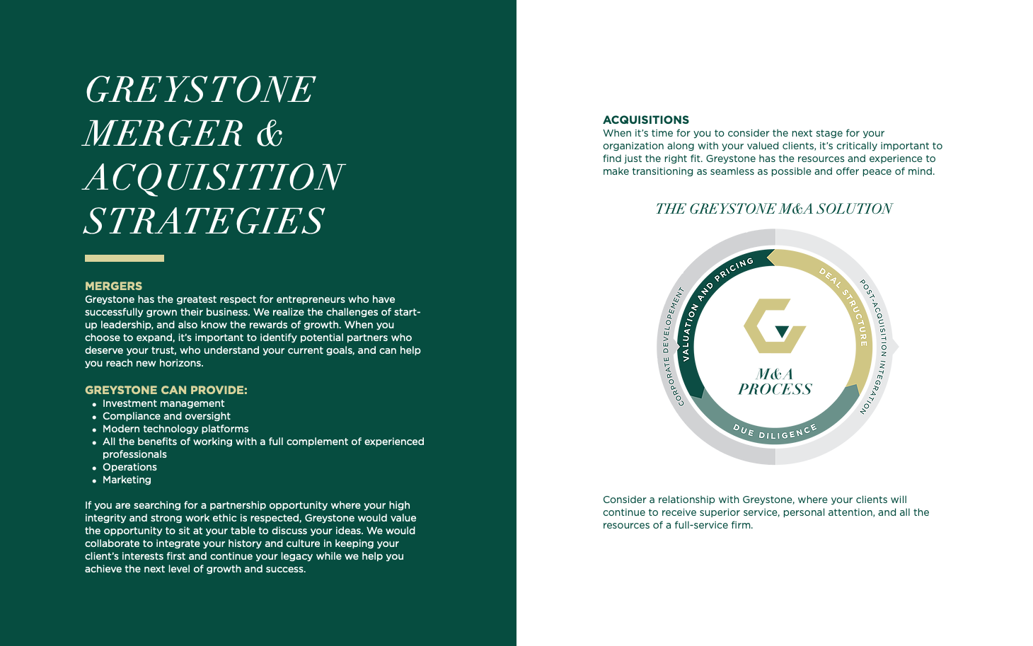 I designed a number of pieces for Greystone, including letterhead, business cards, a general and 401k specific brochure, and a fancy folder to house it all. The folder is embossed with gold foil on a beautiful deep green paper stock. The unique fold mimics the angles in their logo and emphasizes their tagline — Leading You Forward.