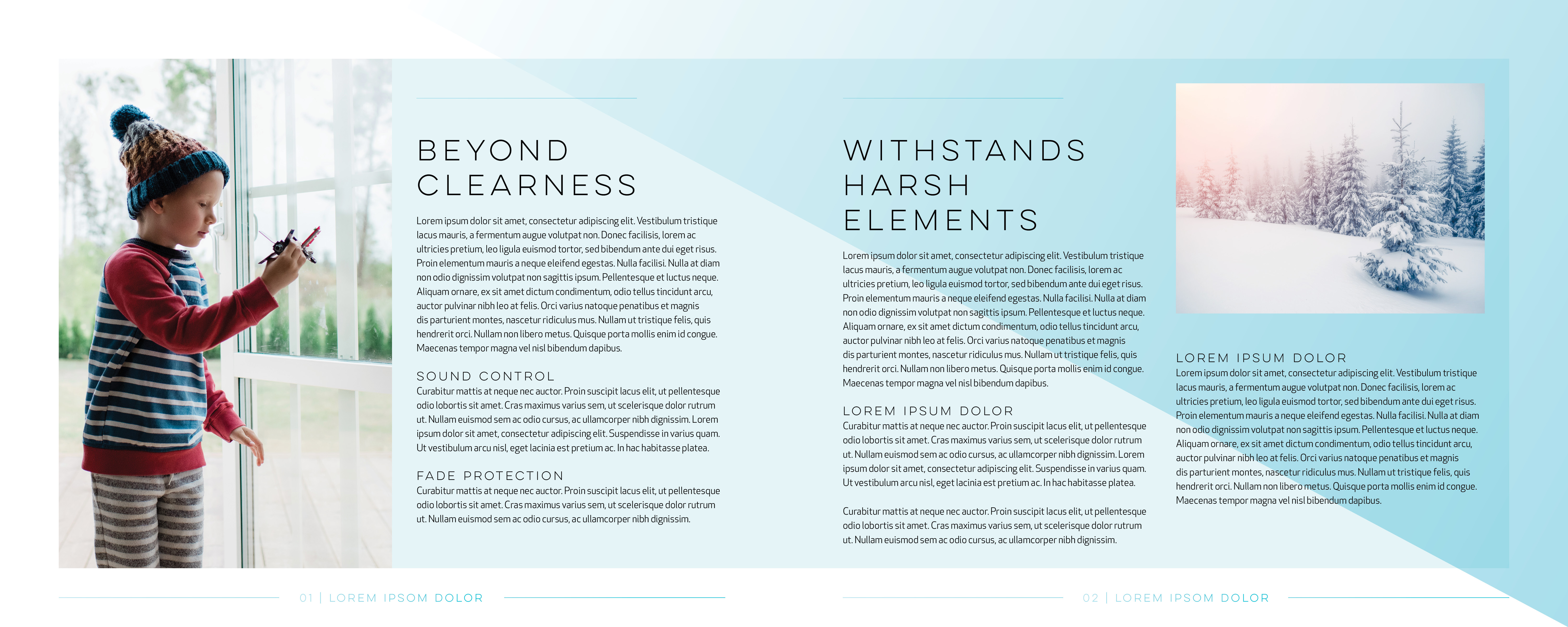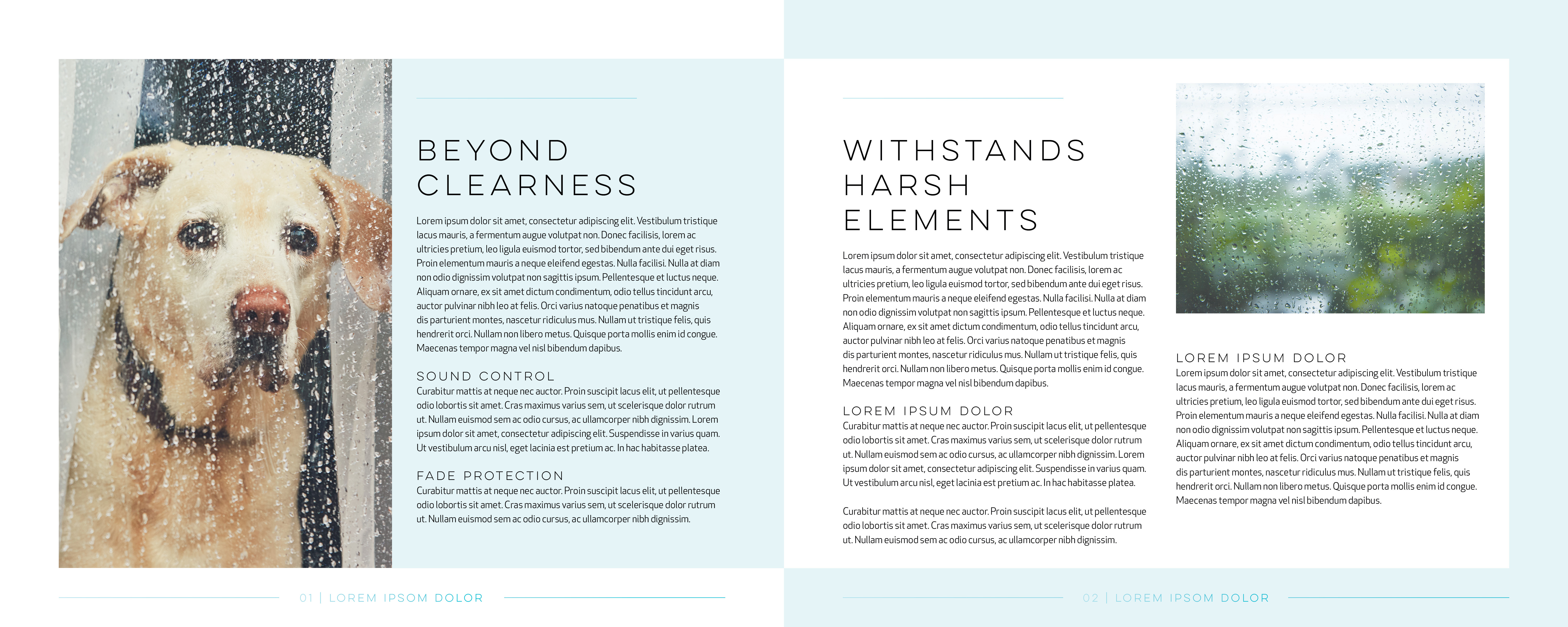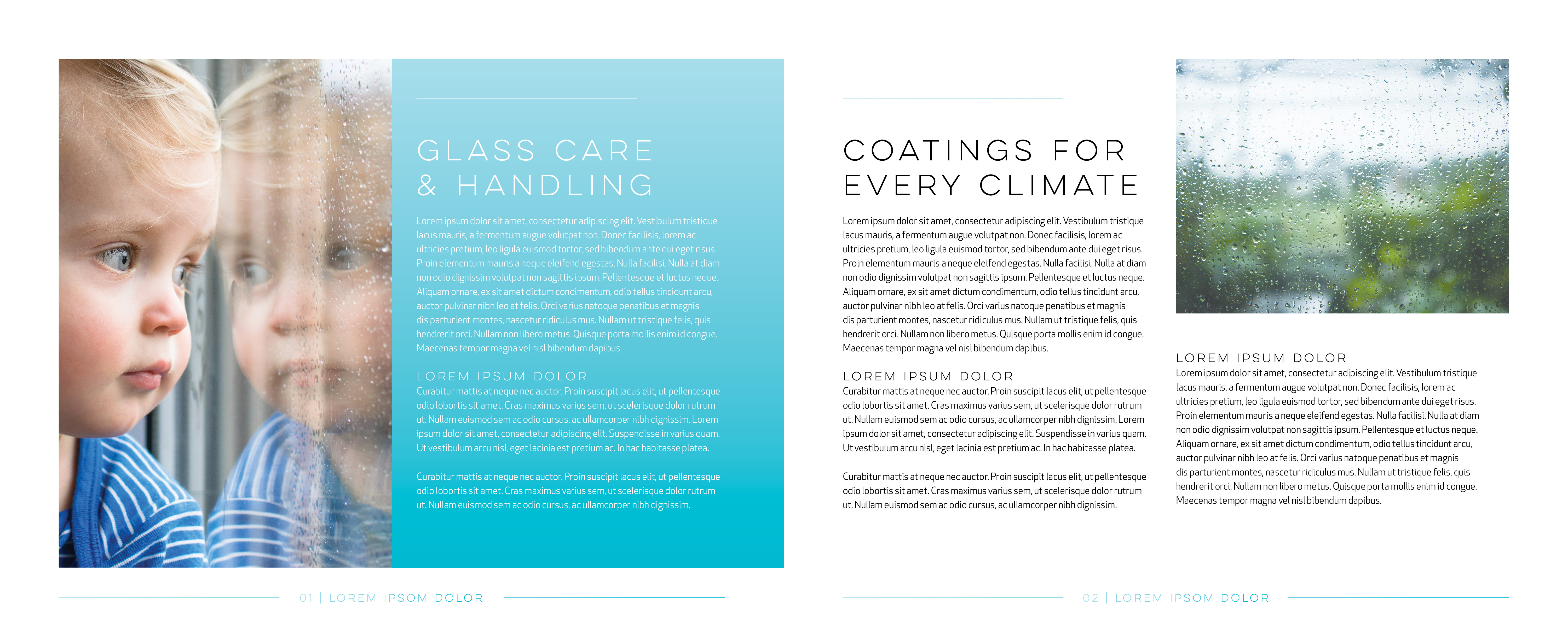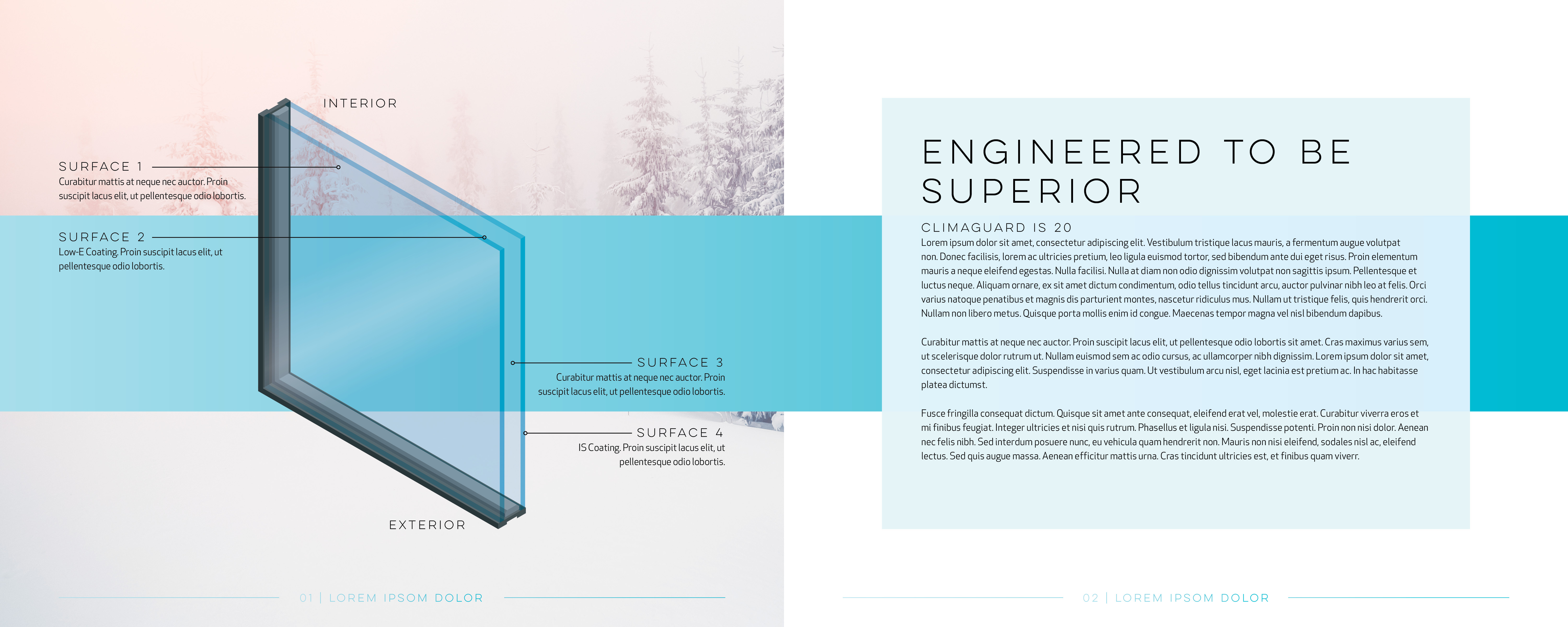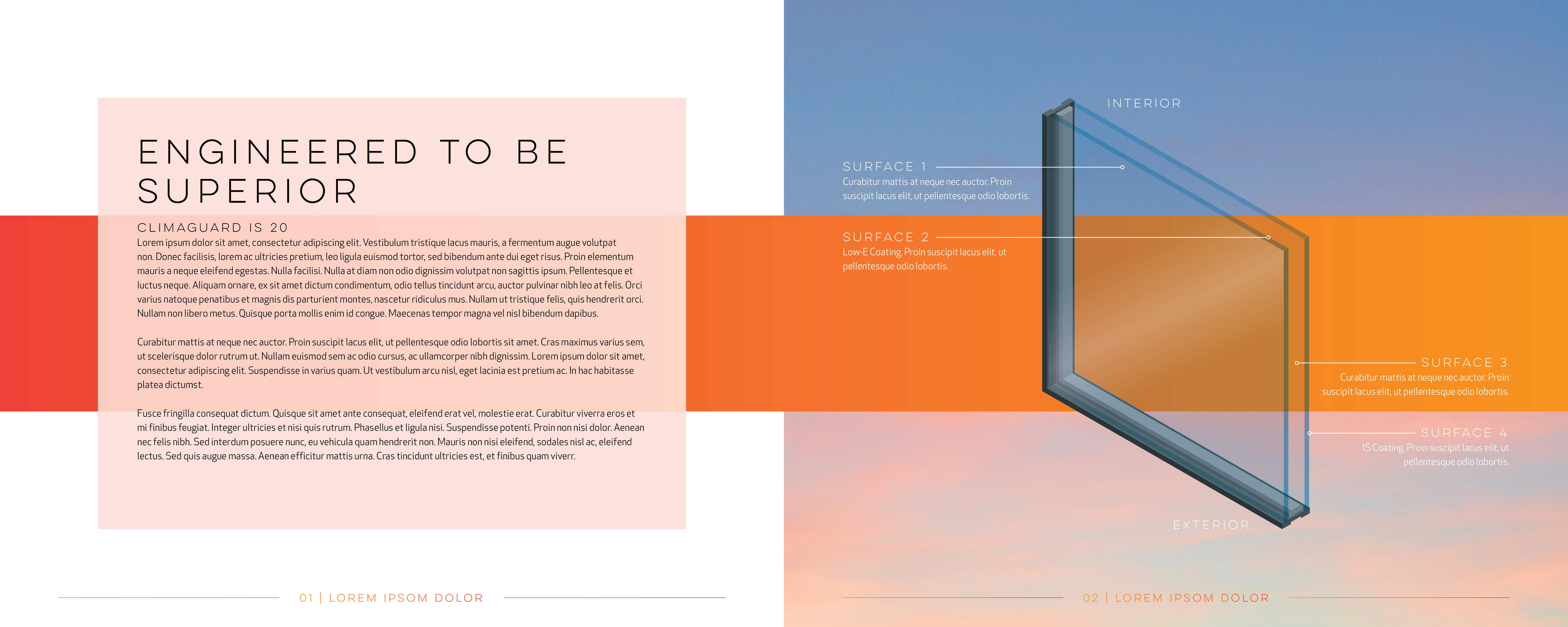 This is a concept brochure for residential customers of Guardian Glass. I used warm and cool colors to help illustrate their many options of coatings for every climate. I chose a collection of family centric and atmospheric photography to emphasize the tagline – There’s so much more behind our glass.